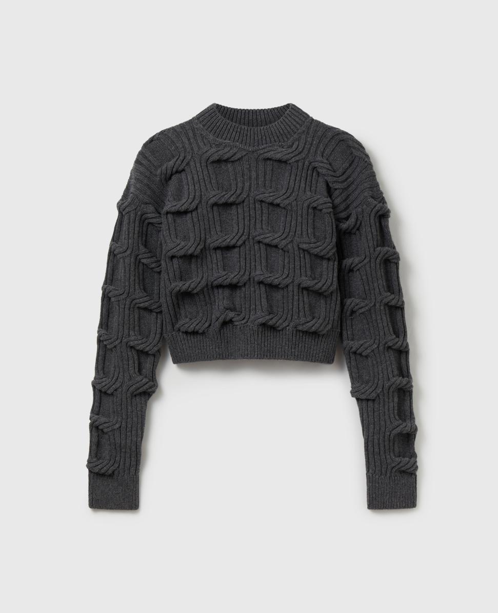 Item 6K09113S25511267 This sculptural sweater is architected from RWS-certified wool in a dramatic cable-knit pattern inspired by our iconic Falabella chain. Topped with a classic crewneck and ribbed trims, pair it effortlessly with our vegan Falabella tote.