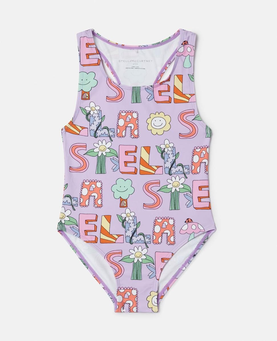 Traje de baño morado con estampado de letras de Stella McCartney | Traje de baño para niños