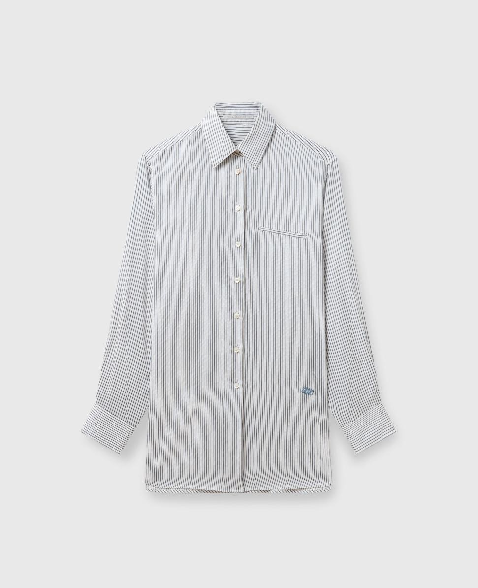 Artículo 6200353FR2108519 Confeccionada en seda orgánica con certificación GOTS, esta elegante blusa de manga larga presenta un cuello puntiagudo y un bajo curvo. Entre sus detalles destacan las rayas diplomáticas de inspiración vintage y el logotipo de Stella McCartney bordado en el lateral.