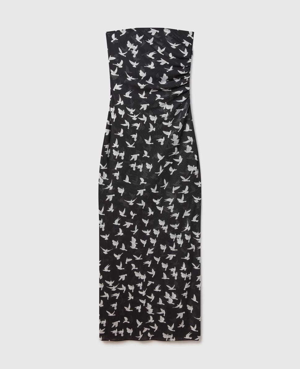 Vestido midi sin tirantes de malla con estampado de palomas de Stella McCartney, blanco y negro | Vestidos de mujer