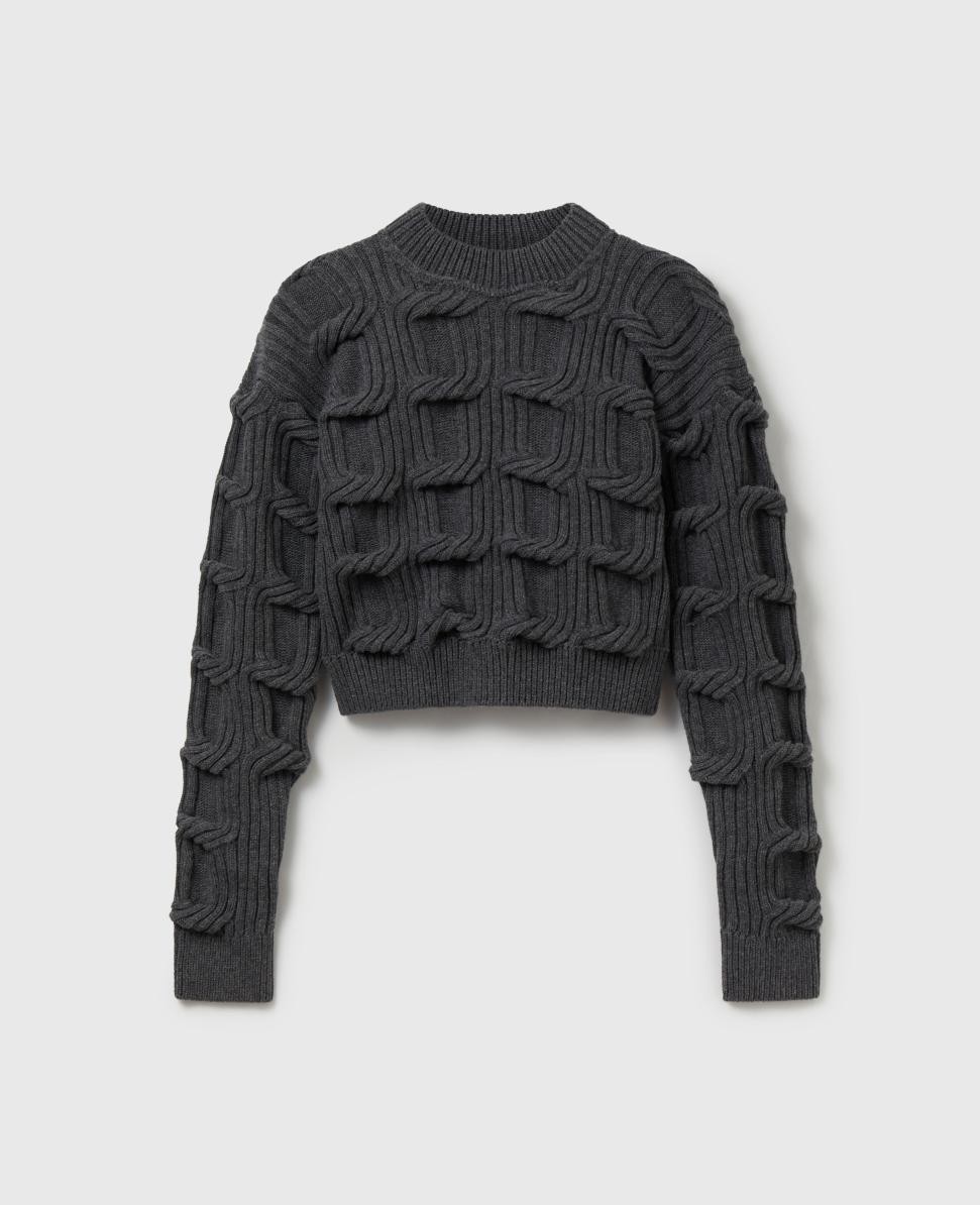 Tuote 6K09113S25511267 Tämä veistoksellinen neulepusero on valmistettu RWS-sertifioidusta villasta dramaattisella palmikkoneulekuviolla, joka on saanut inspiraationsa ikonisesta Falabella-ketjustamme. Klassisen pyöreäkauluksisen ja ribbiresorin ansiosta se sopii vaivattomasti vegaaniseen Falabella-laukkuumme.