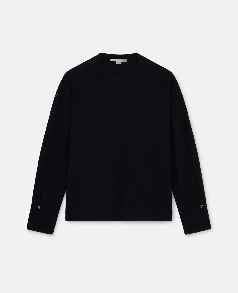 Article 6K04213S24151000 Créez une garde-robe iconique avec ce pull col rond Stella McCartney noir nuit. Confectionné en laine mérinos RWS fine et éco-responsable, il est agrémenté de poignets fendus, signature de Stella.