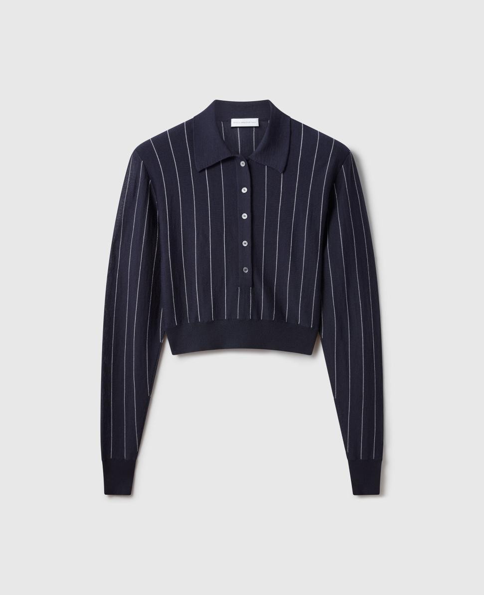 Item 6K10083S25718556 This long-sleeve polo is woven with a sporty attitude in a lightweight, pinstripe knit – inspired by Savile Row tailoring. Consciously crafted from 100% RWS-certified wool, the strong-shouldered top has a pointed collar and button front. Pair it with the coordinating sweatpants.
