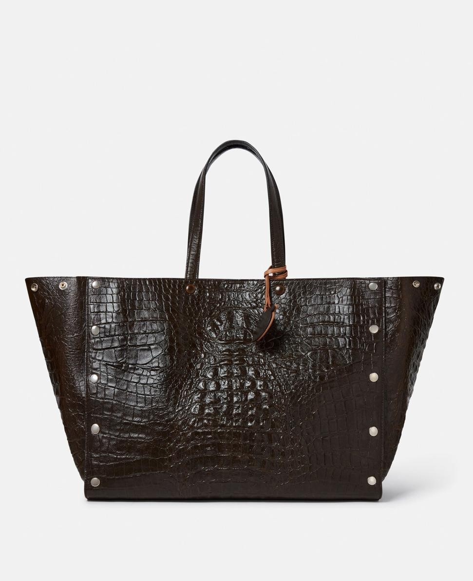 Item 7B0117WP04772025U Introduced on the Winter 2024 runway, this dramatically oversized tote bag is a vegan luxury staple. Each is handcrafted in Italy from croc-embossed UPPEAL, a soft, cruelty-free leather alternative made with apple waste – topped with silver flat studs, continuing this season’s popper story. Generously sized, there’s room for your laptop, phone and other daily essentials inside.