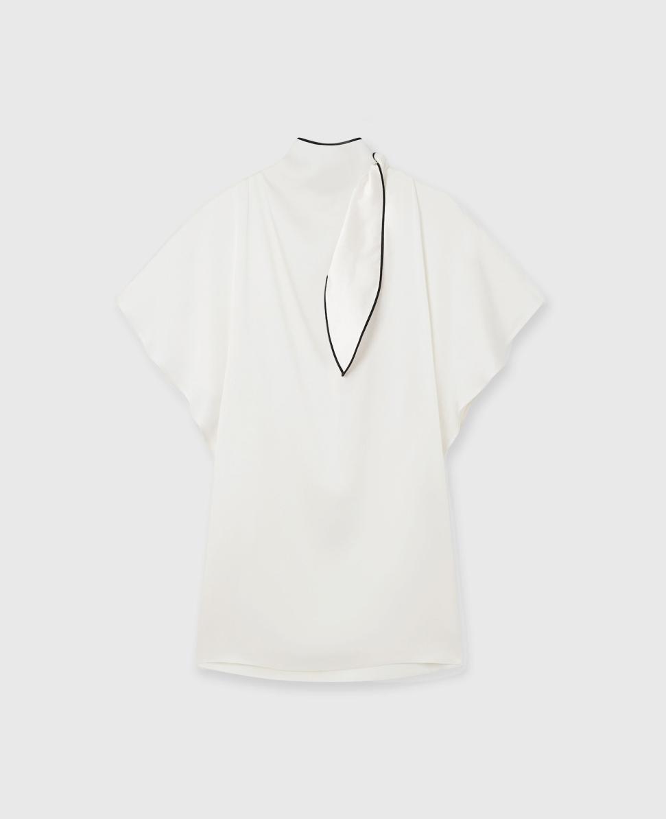 Artikel 6A04673FU3029200 Deze jurk is gemaakt van een glanzende mix van bosvriendelijke viscose en acetaat en heeft een strikband bij de hals, afgezet met contrasterende biezen. De jurk valt soepel over het lichaam, is geaccentueerd met schoudervullingen en heeft korte, gedrapeerde mouwen.