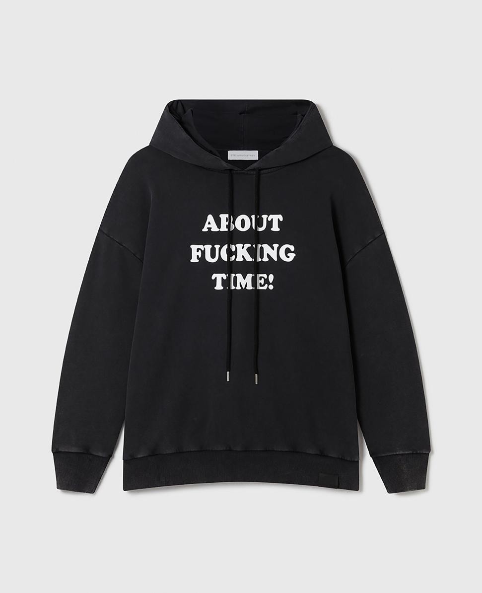 Item6J02643SPZ931082 Este moletom com capuz da Stella McCartney tem um corte folgado em malha macia de algodão orgânico e estampa com a frase "About Fucking Time!" na frente – uma provocação ousada que remete a um look icônico dos arquivos da Stella.