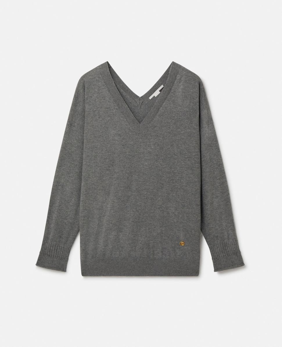 Articol 6K04223S24151202 Îmbogățiți garderoba Stella cu acest pulover super moale cu decolteu în V de la Stella McCartney, în culoarea gri mediu. Confecționat din lână merinos RWS, într-un tricotaj fin, silueta sa relaxată și umerii căzuți îl fac un accesoriu de bază.