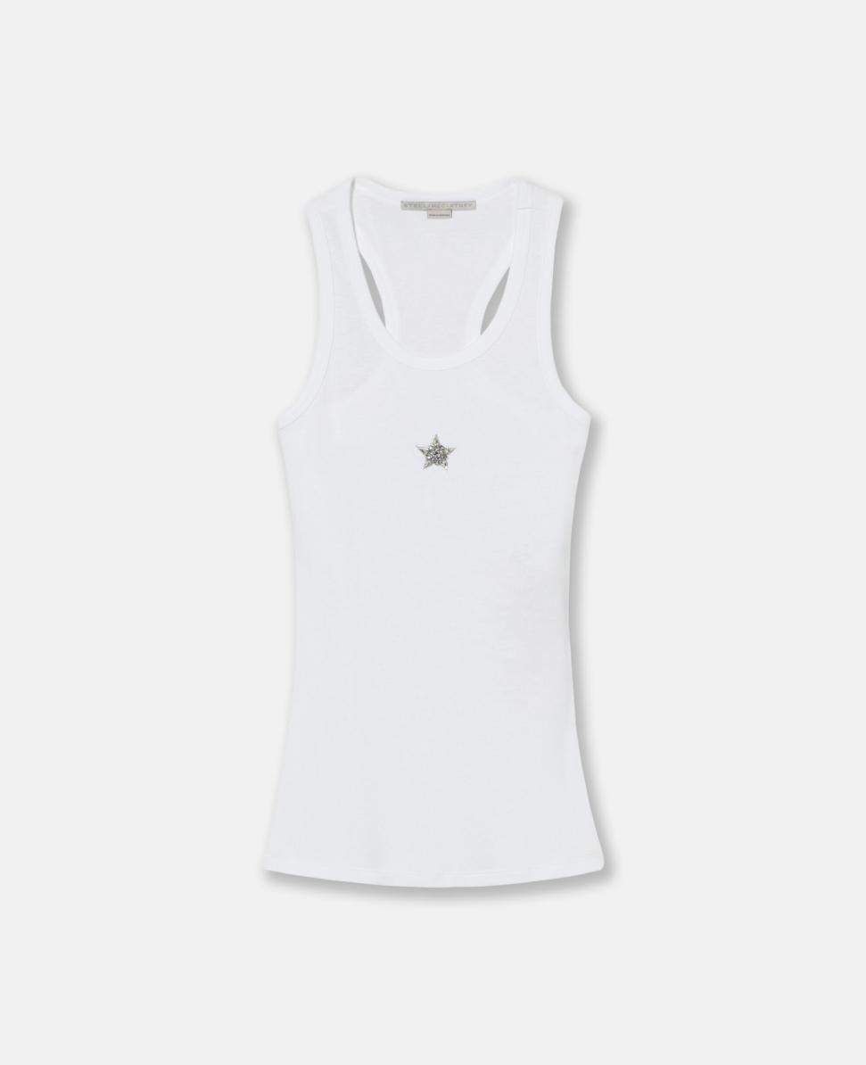Artikel 6J02913SPZ119000 Stjärnor finns i Stella McCartneys design-DNA. Du hittar den här med glittrande blyfria kristaller, mitt fram och fram på detta minimalistiska, vita bomullslinne. Trä på dig den med de ikoniska lågmidjade jeansen för en stjärnspäckad look från topp till tå.