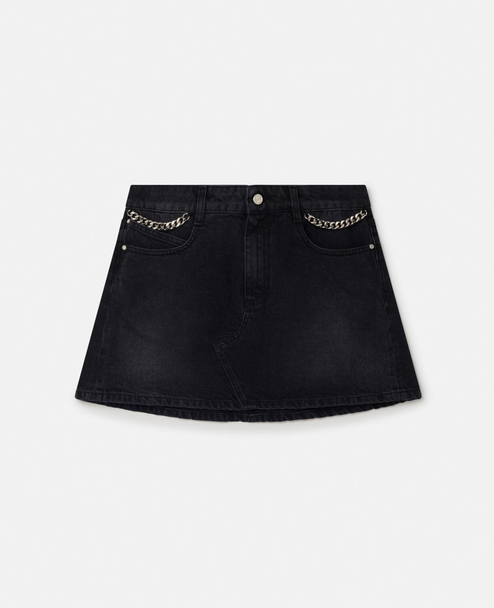 Artikel 6D01883SPH441000 Förändra spelet med denna svarta denimminikjol från Stella McCartney, ansvarsfullt tillverkad av ekologisk bomullsdenim. Kjolen är medvetet detaljerad med diamantslipade Falabella-kedjor vid fickorna och en Falabella-inspirerad bälteshälla bak.