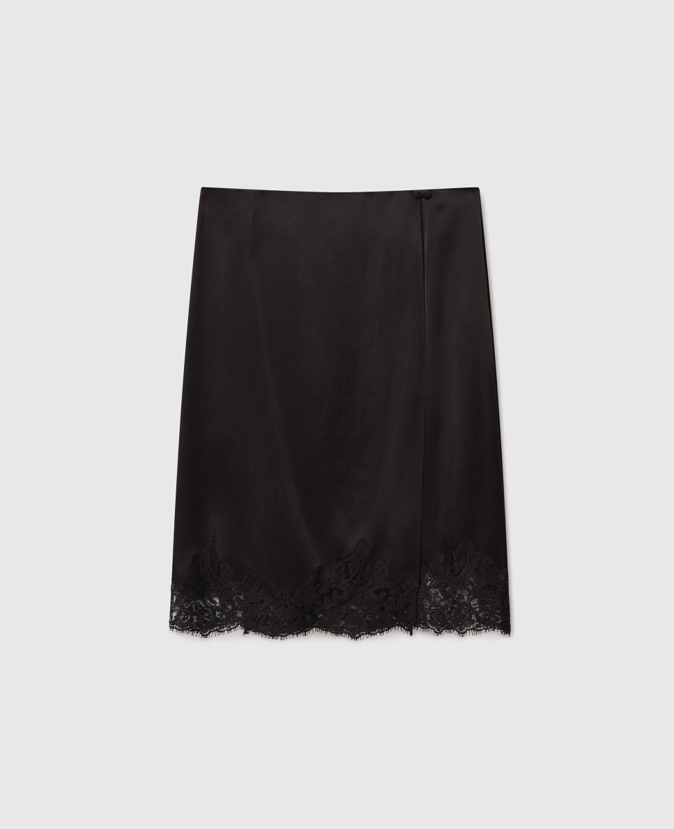 Item 6300403AU3091000 This little black skirt is elevated with a luxurious floral guipure lace, exclusive to Stella McCartney. Crafted from satin with forest-friendly viscose, the skirt is lightweight and malleable, bringing decadent texture to the Autumn 2023 wardrobe.